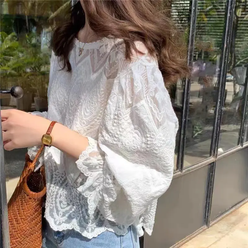 圖案 素面穿著效果 顯瘦線條 寬鬆衣門襟 套頭領型 圓領季節 夏 , 春流行元素 拼接 , 鏤空 , 刺繡面料材質 聚酯纖維袖型 燈籠袖風格 森系 , 經典款袖長 長袖穿著場合 假日/出外