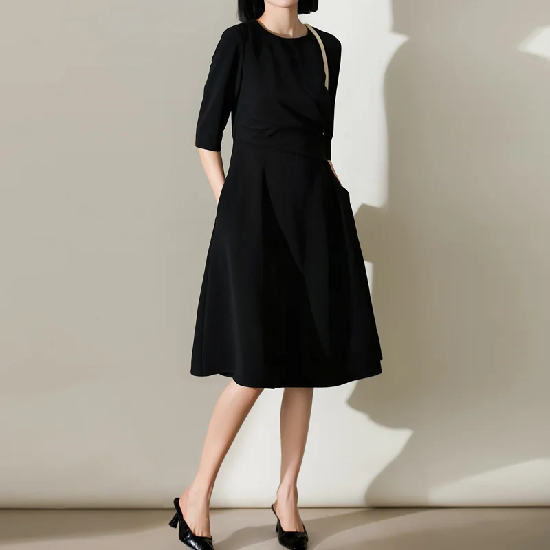 法式 船領 腰間捏褶 氣質 五分袖 約會洋裝