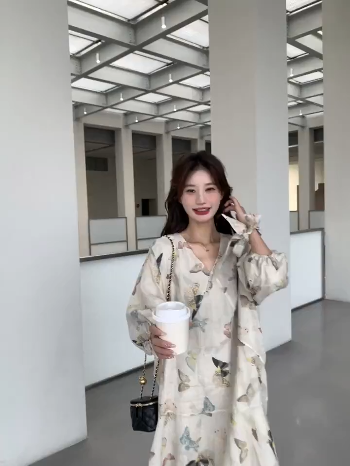 [此商品腰帶為隨機贈送配件喔~]圖案 印花衣長 長款領型 V領季節 秋 , 春,夏流行元素 腰帶 , 印花布料材質 棉 , 聚酯纖維袖型 燈籠袖風格 休閑 , 時尚 , 簡約袖長 七分袖穿著感 寬鬆