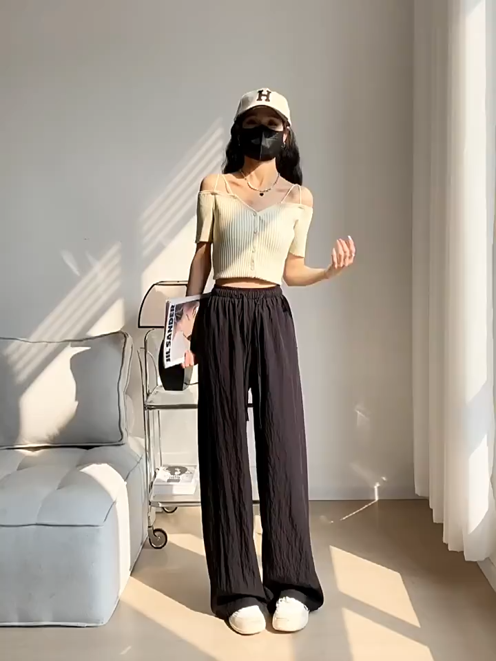 冰絲皺寬褲薄款高腰垂感日系慵懶直筒褲肌理感褶皺休閒褲女