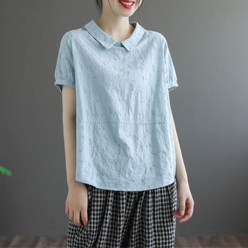 鏤空蕾絲文藝復古寬鬆顯瘦娃娃領短袖T恤 法式99支純細支亞麻襯衫