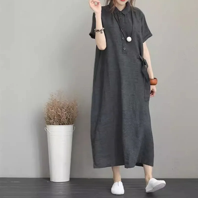 簡約好搭 日式素面棉麻翻領連身裙 短袖寬鬆休閒洋裝 顯瘦長款