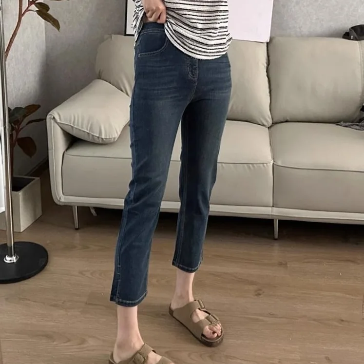 彈性冰絲直筒牛仔褲 九分褲 薄款開叉顯瘦