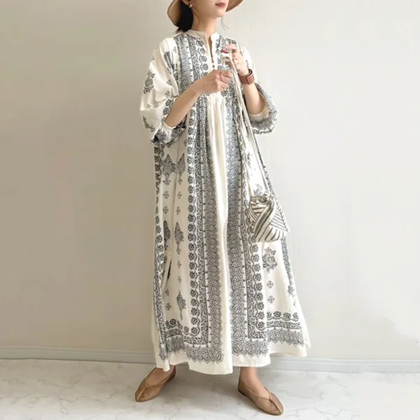 日系慵懶風五分袖印花連身裙 休閒洋裝度假風