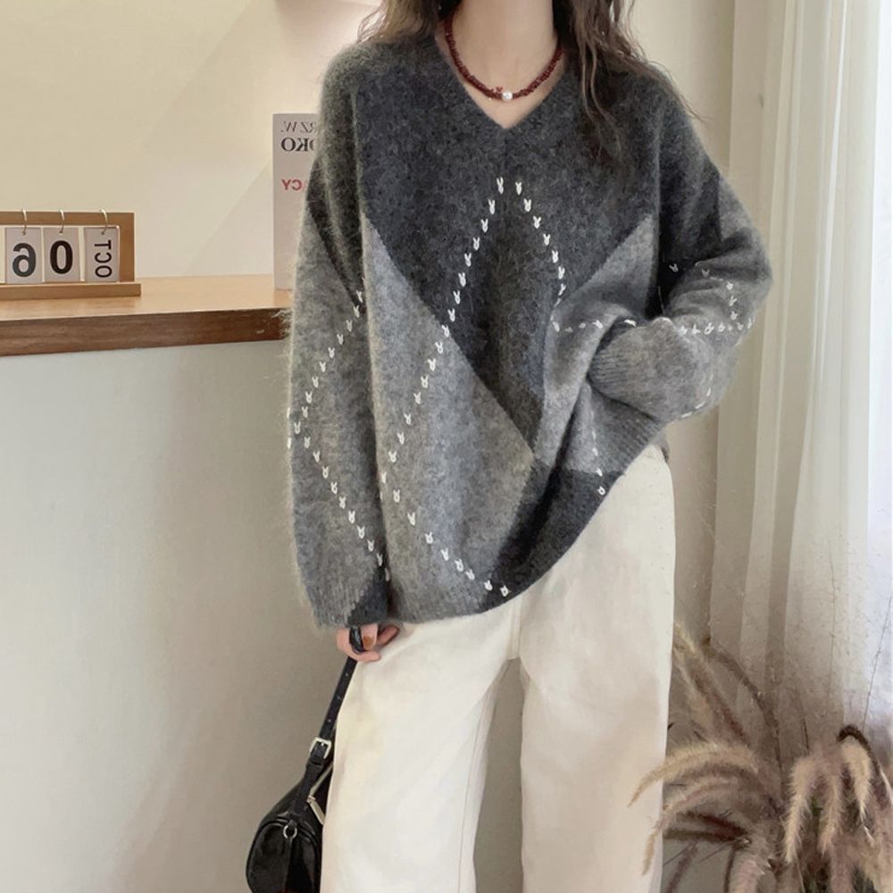 慵懶復古菱格針織毛衣 軟糯撞色秋冬紅色系寬鬆休閒針織衫上衣