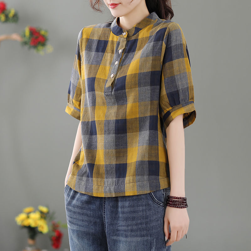 昭和風窗格紋棉麻罩衫 大尺碼衬衫上衣