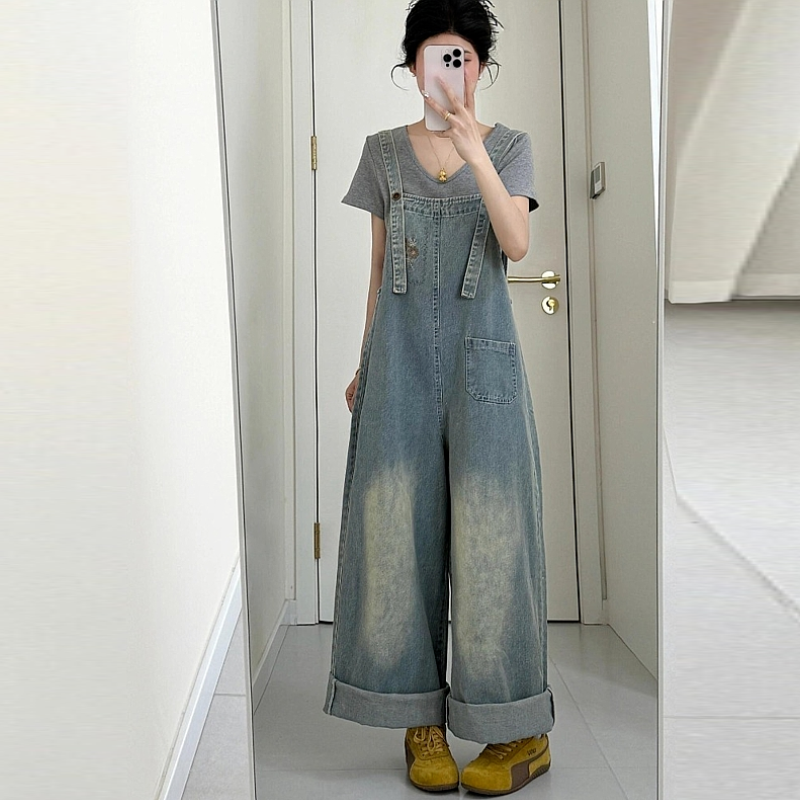 文青復古牛仔背帶褲 春夏刺繡逆齡鹽洗工藝牛仔寬褲 偽腰封高腰A字剪裁