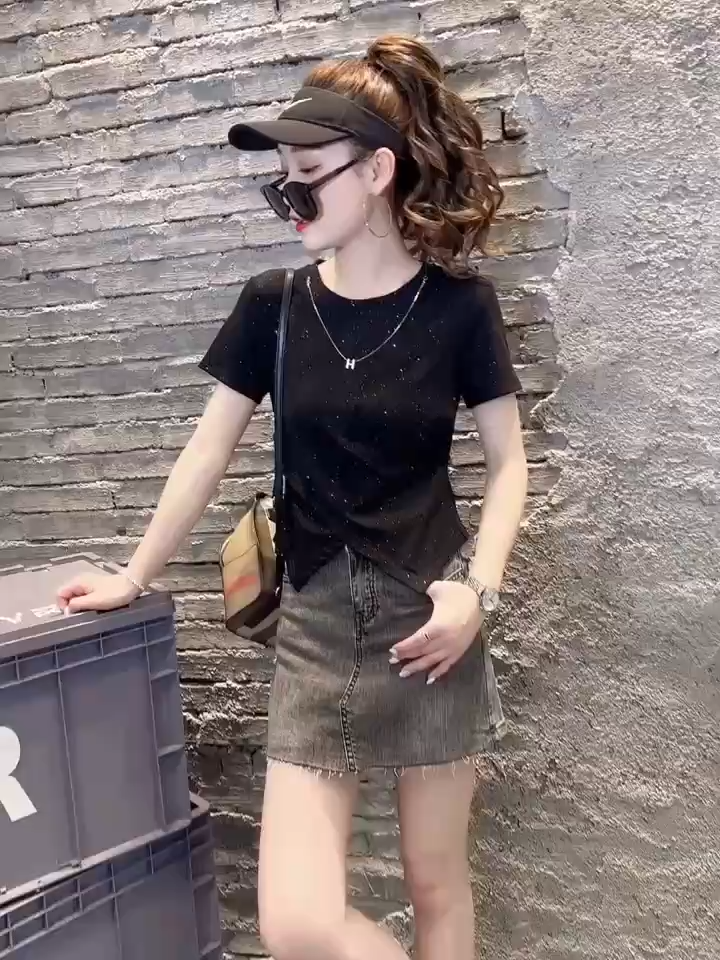 亮閃閃不規則短款短袖T恤 開叉設計感小眾獨特上衣