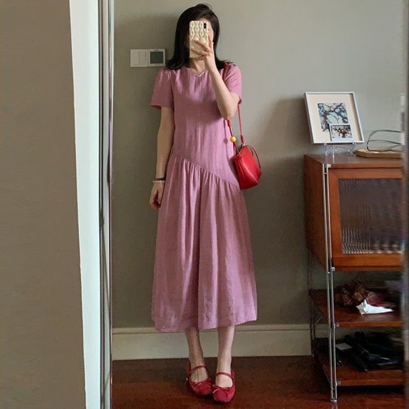 素色棉麻連身裙 韓系減齡棉質鬆身洋裝