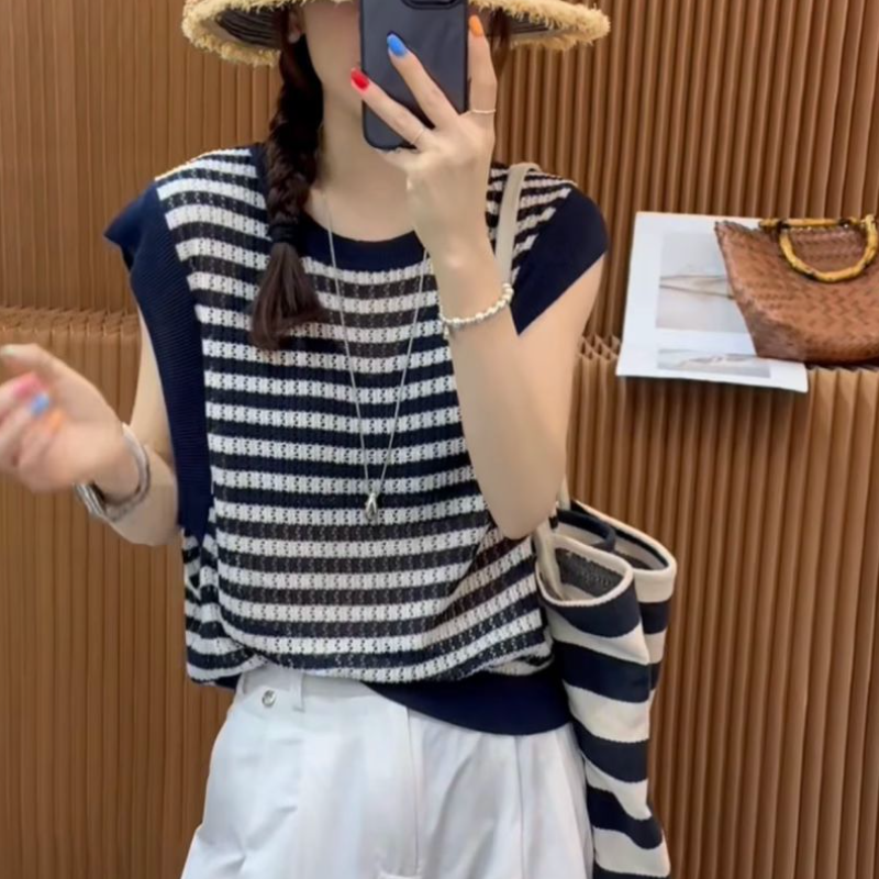 夏季冰涼針織鏤空上衣 條紋圓領小飛袖T恤 寬鬆百搭款