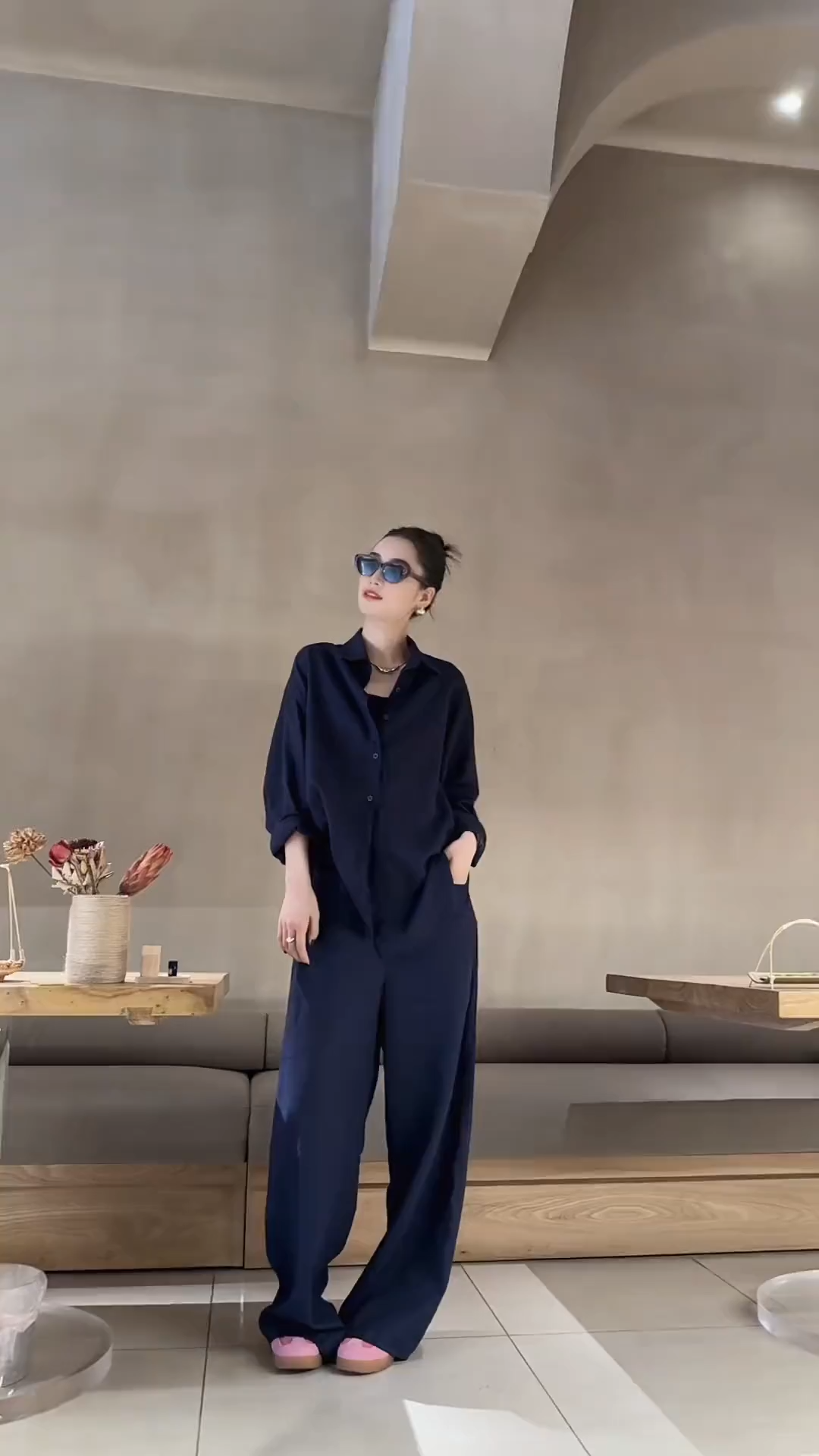 極簡風通勤兩件式套裝 深藍寬鬆襯衫+休閒寬褲 氣質高級感
