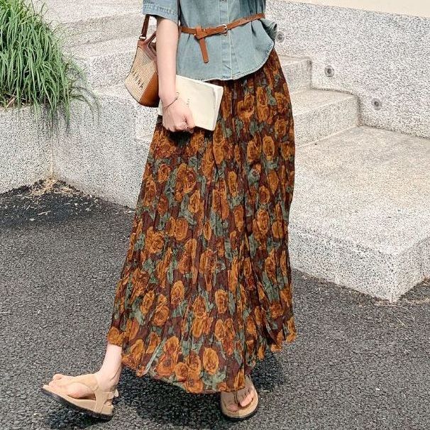 復古兩件式套裝 短袖牛仔襯衫+碎花中長裙 成套穿搭