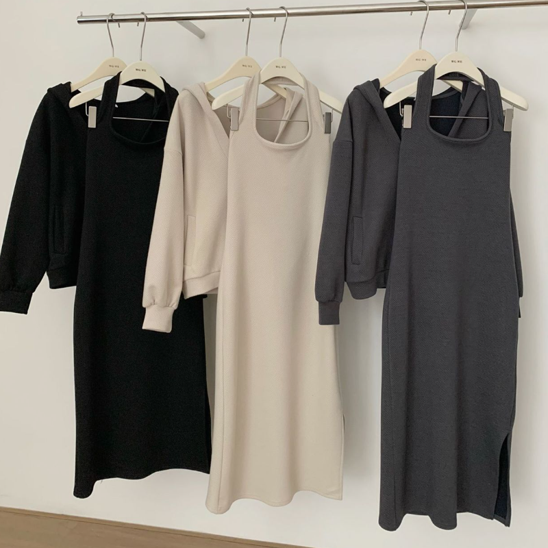 兩件式套裝 連帽V領上衣+繞頸連身裙(固定式、後背鬆緊) 寬鬆休閒顯瘦