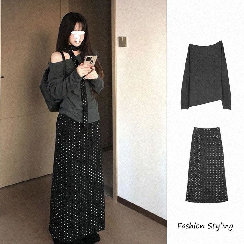 甜辣感一字領長袖上衣+小圓點A字長裙 早秋套裝