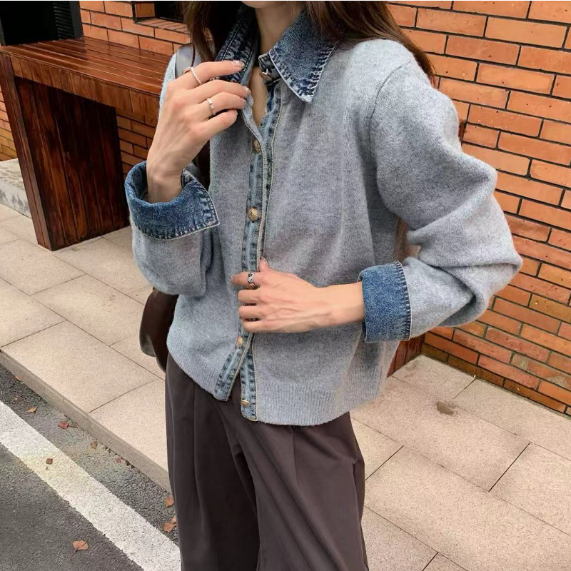 韓系牛仔拼接針織外套 厚磅質感 層次襯領設計