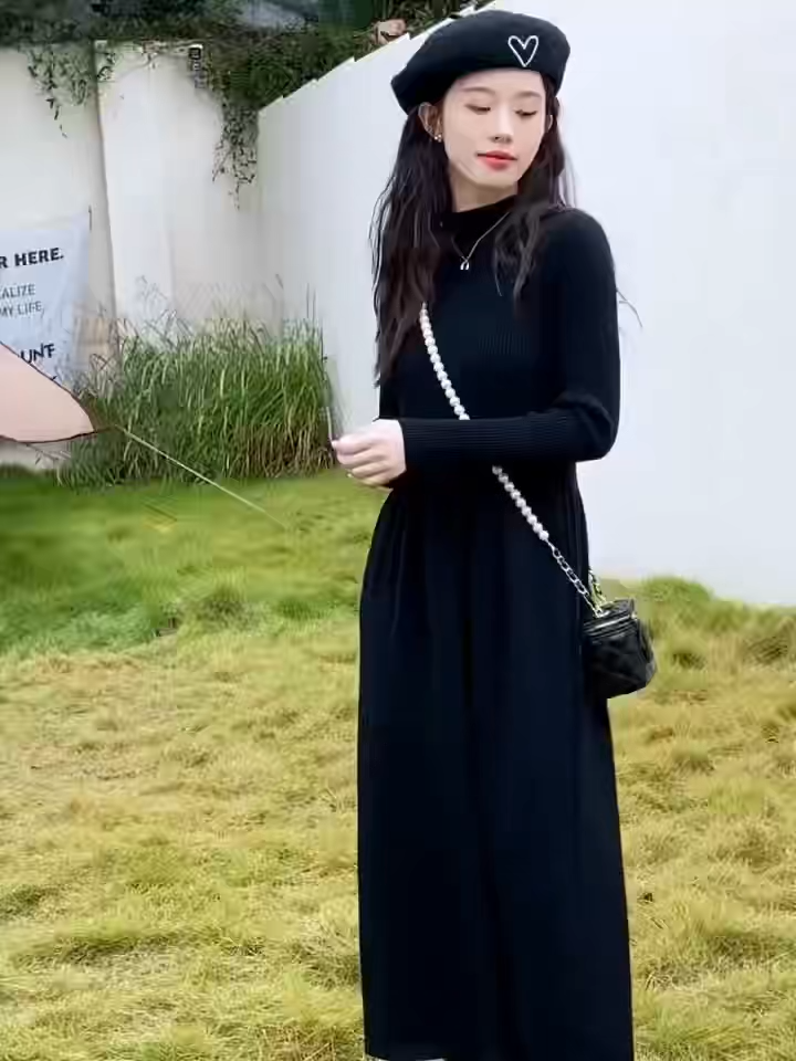 赫本風小黑針織長洋裝 過膝長度 修身剪裁 秋冬搭大衣超有型