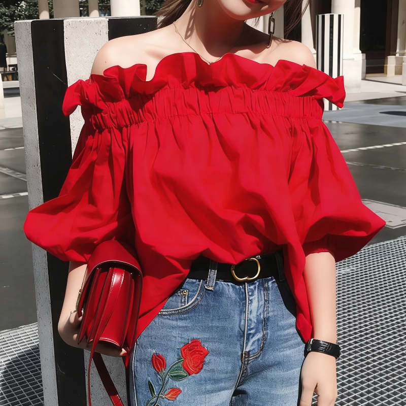 韓系浪漫一字領鬆緊紅色上衣 五分袖設計感襯衫 顯白亮紅鬆緊抓皺